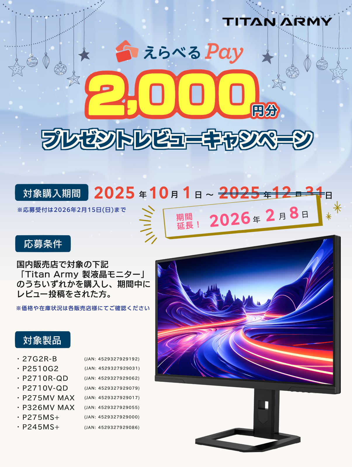 2025年11月21日 お知らせ えらべるPay 2,000円分をプレゼント!Titan Army 製ゲーミングモニターレビューキャンペーン第3弾!好評につき期間延長 株式会社リンクスインターナショナル(本社:東京都千代田区、代表取締役:川島義之)は、好評発売中のTitan Army 製ゲーミングモニターのうちいずれかを購入し期間中にレビュー投稿をされた方へ、えらべるPay 2,000 […]