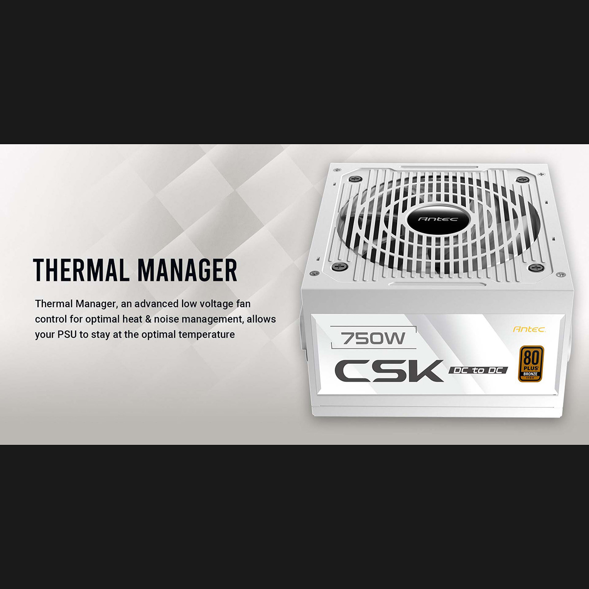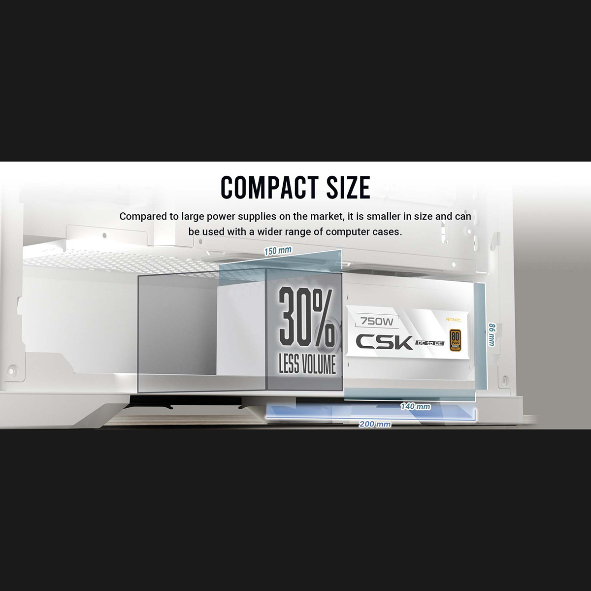 CSK750DC Whiteは、80PLUS BRONZE 認証を取得した高効率高耐久電源ユニットです。直付けタイプのノンモジュラー方式を採用、奥行き140 mmのコンパクト設計で、コストパフォーマンスに優れているので価格を抑えて組み込みたい方に最適な電源ユニットです。