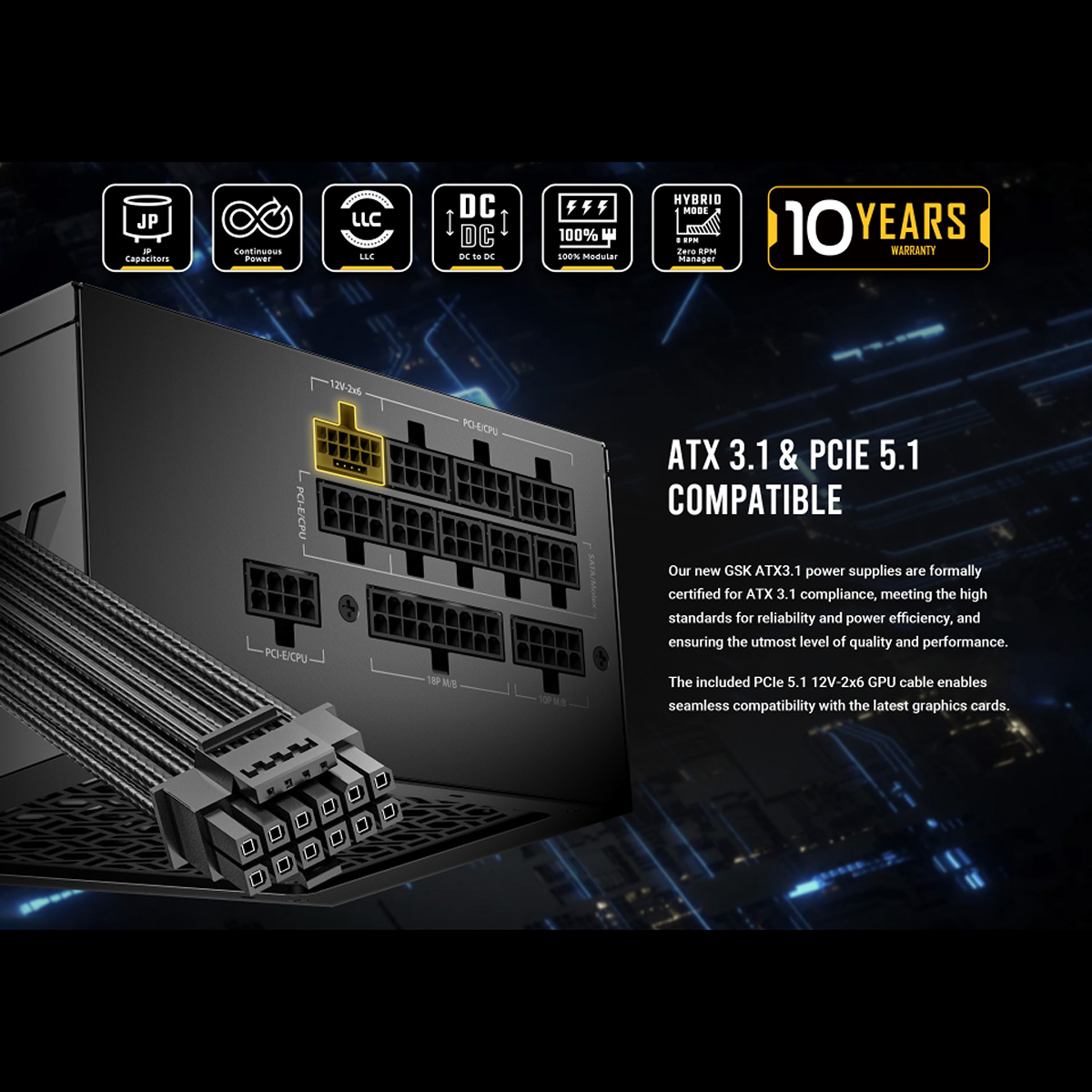 GSK1000 ATX3.1 は、80PLUS GOLD 認証を取得した高効率高耐久電源ユニットです。ケーブルマネジメントに優れたフルモジュラーケーブルを採用、奥行き140 mmのコンパクト設計で、小型ケースにも最適な電源ユニットです。ATX3.1、PCIe 5.1に対応しているのでRTX 50シリーズにも対応している長期10年保証を付帯した1000W電源。