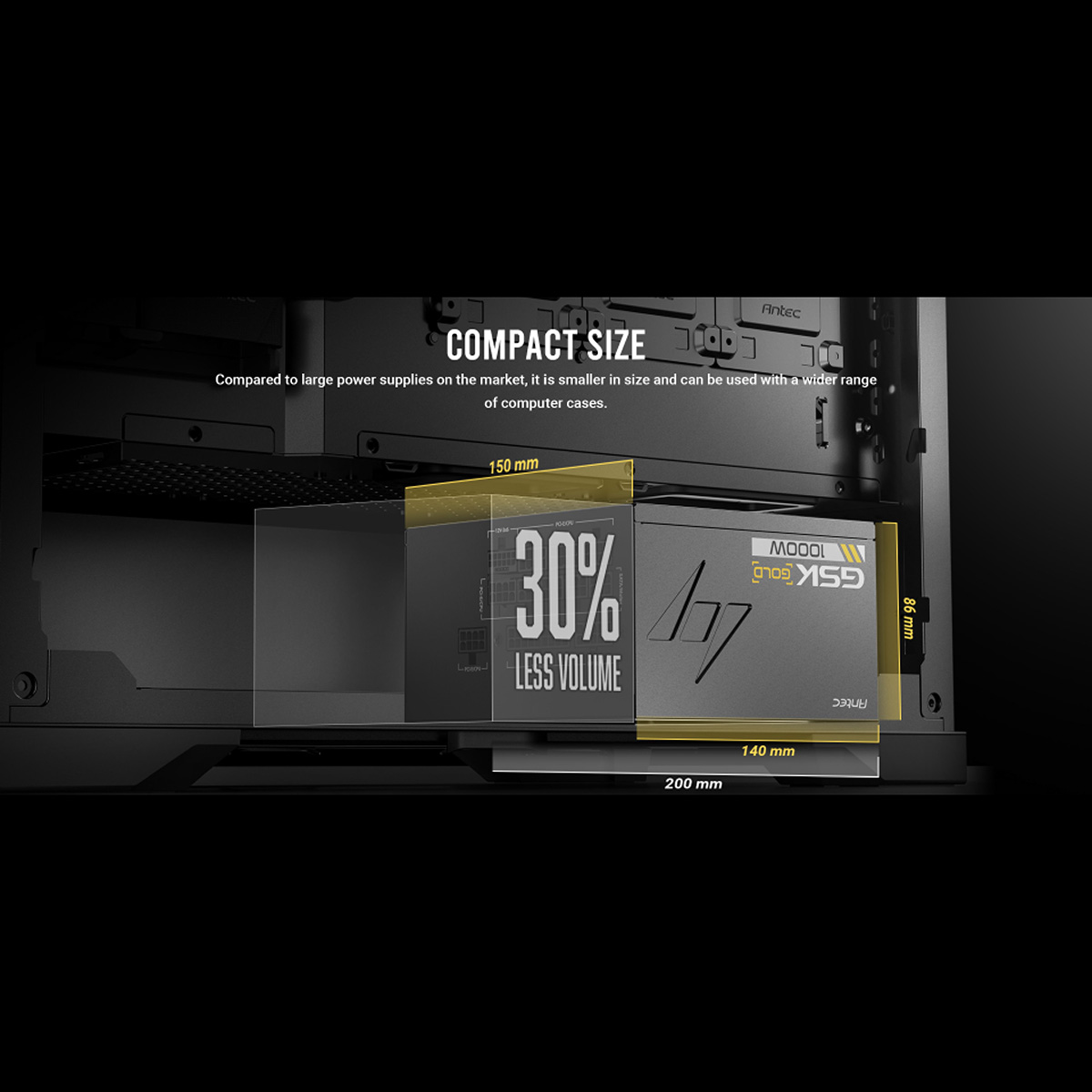 奥行140 mmのコンパクト設計を採用しています。フルモジュラーケーブルを採用しているのでMicro-ATXケースなど、限られたスペースにも無理なく簡単に組み込むことが可能です。