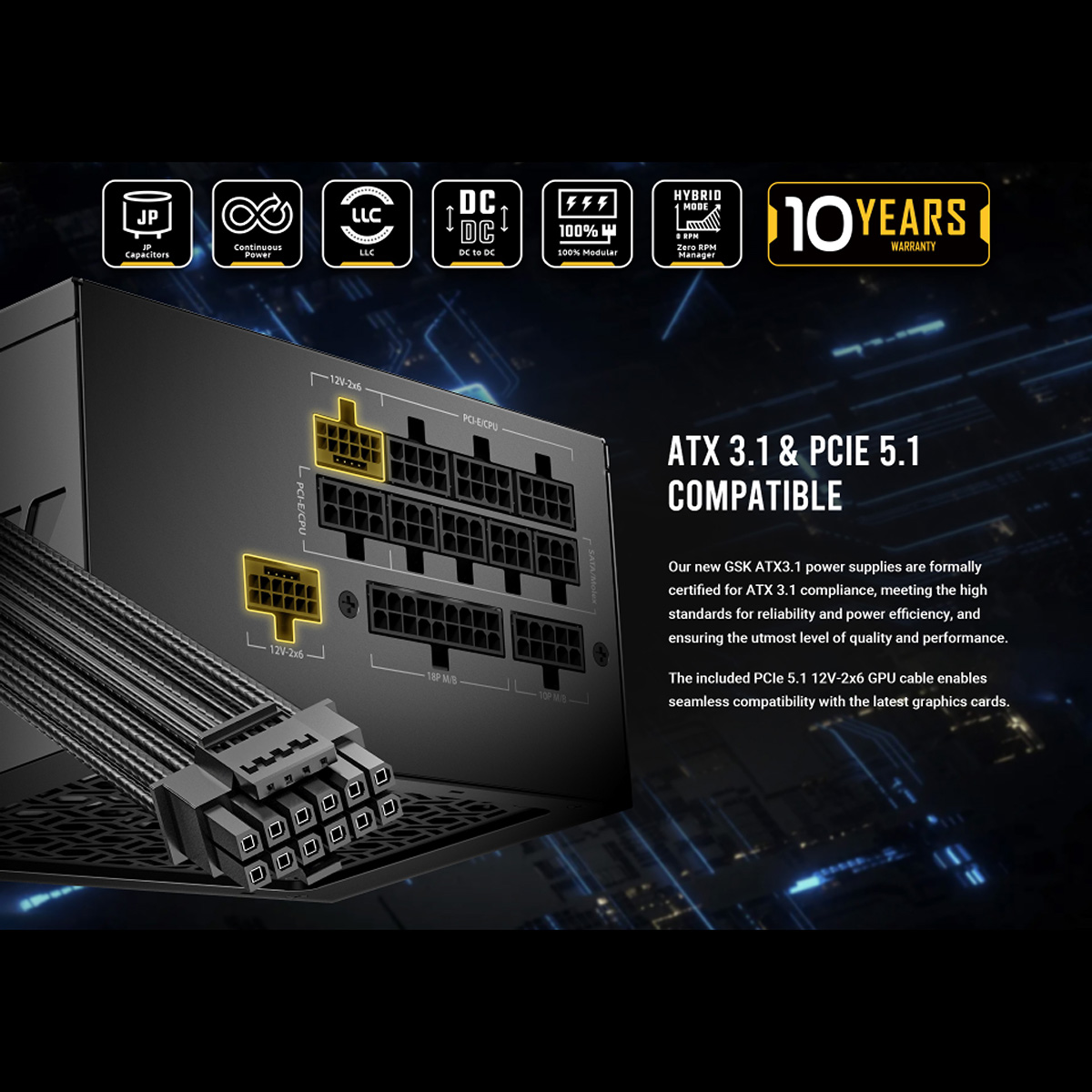 GSK1200 ATX3.1 は、80PLUS GOLD 認証を取得した高効率高耐久電源ユニットです。ケーブルマネジメントに優れたフルモジュラーケーブルを採用、奥行き140 mmのコンパクト設計で、小型ケースにも最適な電源ユニットです。ATX3.1、PCIe 5.1に対応しているのでRTX 50シリーズにも対応している長期10年保証を付帯した1200W電源。