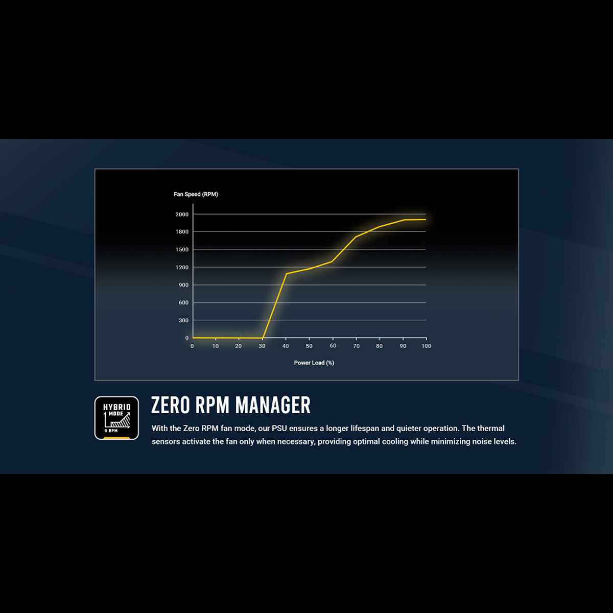 80PLUS GOLD 認証を取得しています。効率性が高いほど、低発熱で耐久性が向上します。電気代の節約と環境にやさしい電源です。GOLDは、電源の負荷率が20%のとき変換効率が 87%以上、負荷率が50%のとき変換効率が90%以上、負荷率が100%のとき変換効率が87%以上の効率を持つ電源のみ取得できます。