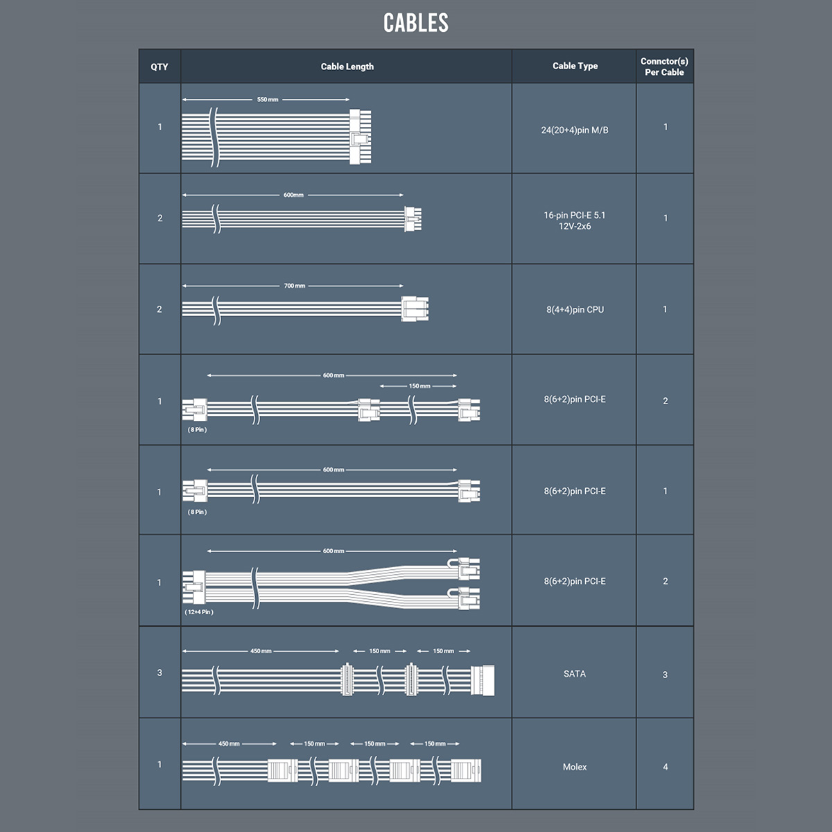 | 16ピンPCI-E 5.1電源ケーブル 約600mm(1本に1つの16ピンPCI-E電源コネクタ) | 2 |