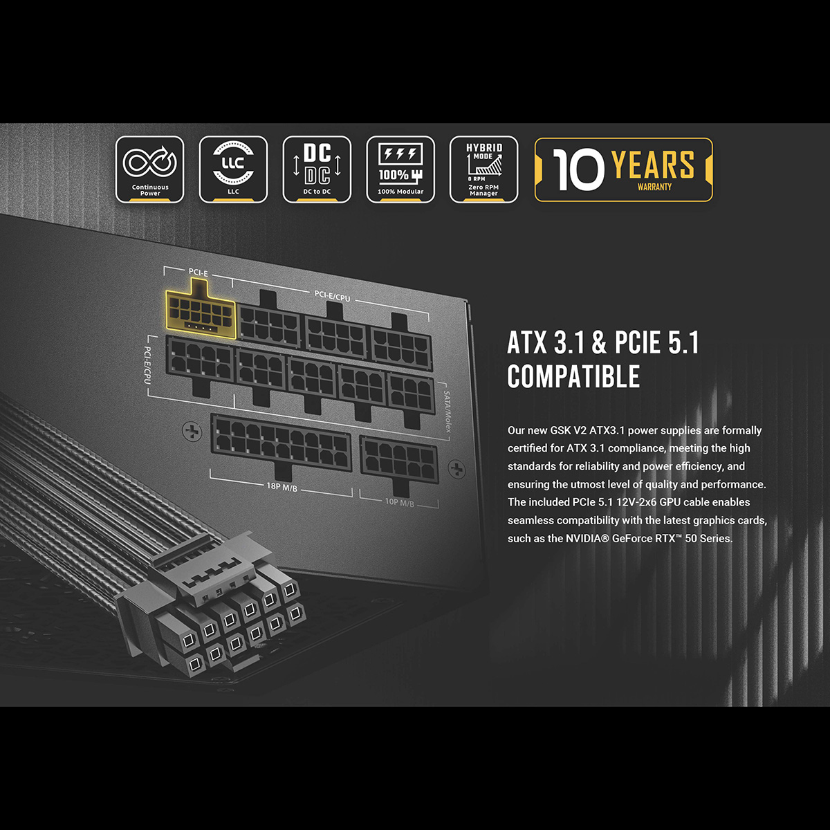 GSK850 V2 ATX3.1は、80PLUS GOLD 認証を取得した高効率高耐久電源ユニットです。ATX3.1 PCIe5.1に対応しているので、最新のグラフィックボードも難無く対応しています。またケーブルマネジメントに優れたフルモジュラーケーブルを採用し、奥行き140 mmのコンパクト設計で、小型システムに最適な電源ユニットです。