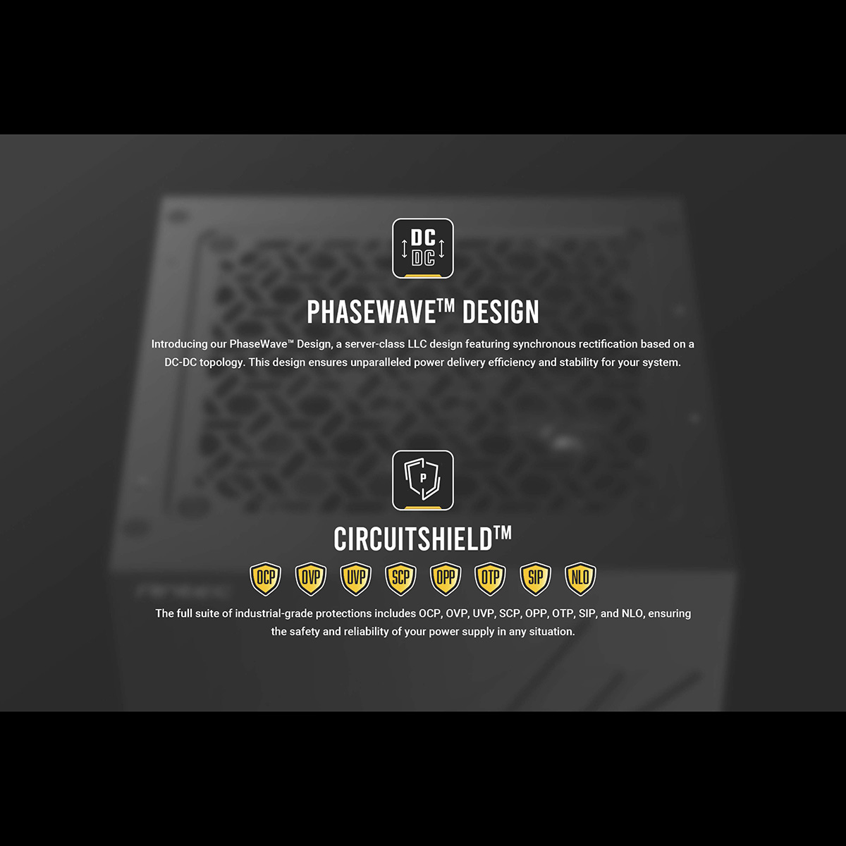 力率改善回路アクティブPFCは、入力電圧の波形を調整し電源の力率を改善します。提供される電力が損失されることなく、効率的に利用できます。またユニバーサルAC入力(100-240VAC)機能により、切り替えスイッチを操作する手間が解消されています。