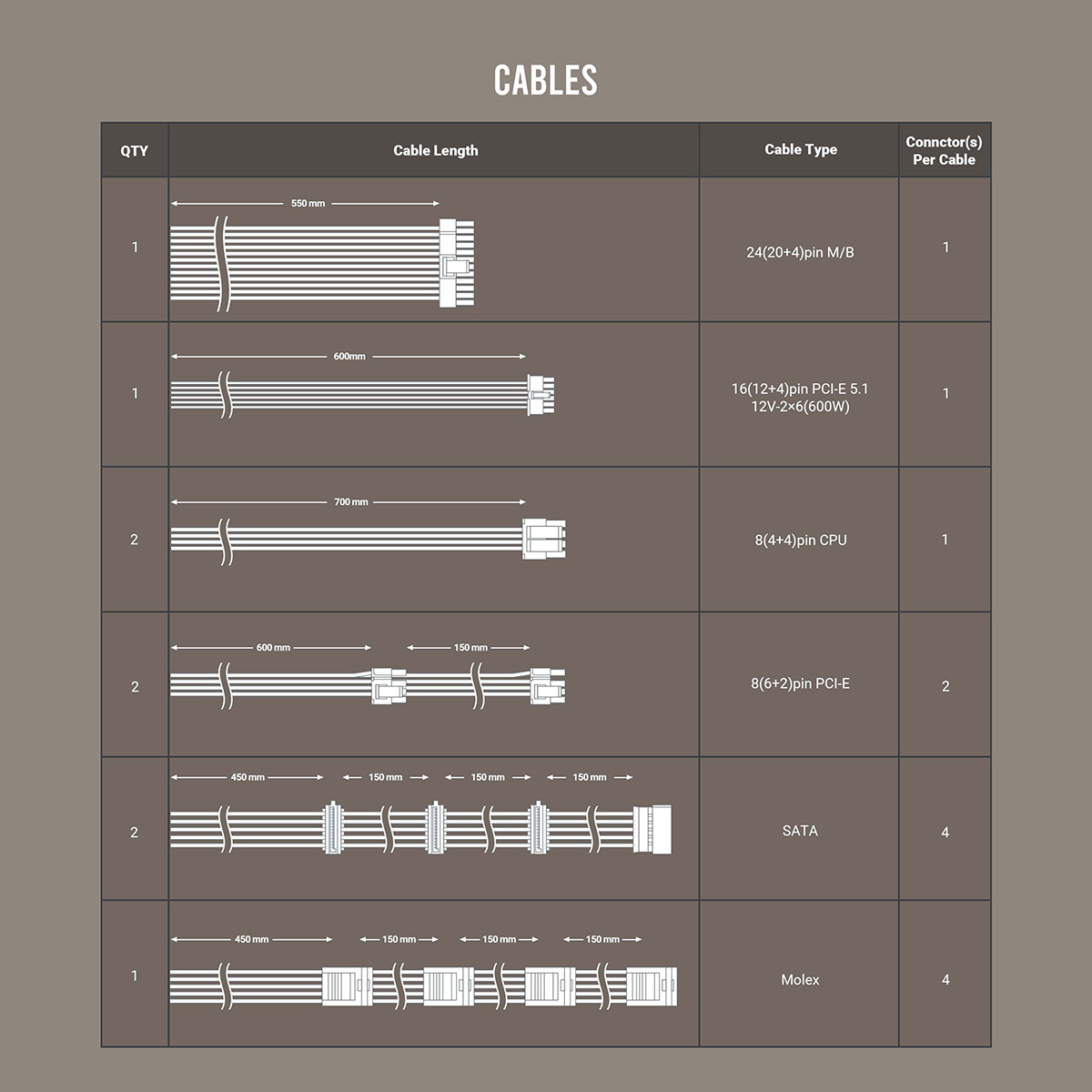 | 16ピンPCI-E 5.1電源ケーブル約600mm (1本に1つの16ピンPCI-E電源コネクタ) | 1 |