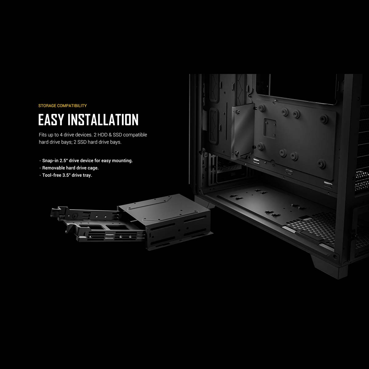 2つの3.5/2.5インチ併用シャドウベイ、2つの2.5インチ専用シャドウベイを備えています。3.5/2.5インチ併用シャドウベイは脱着式で、取り外すことで奥行の長い電源やケーブルのためのスペースを確保することができます。