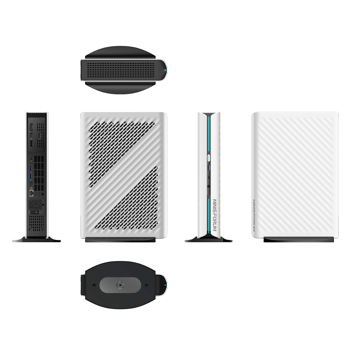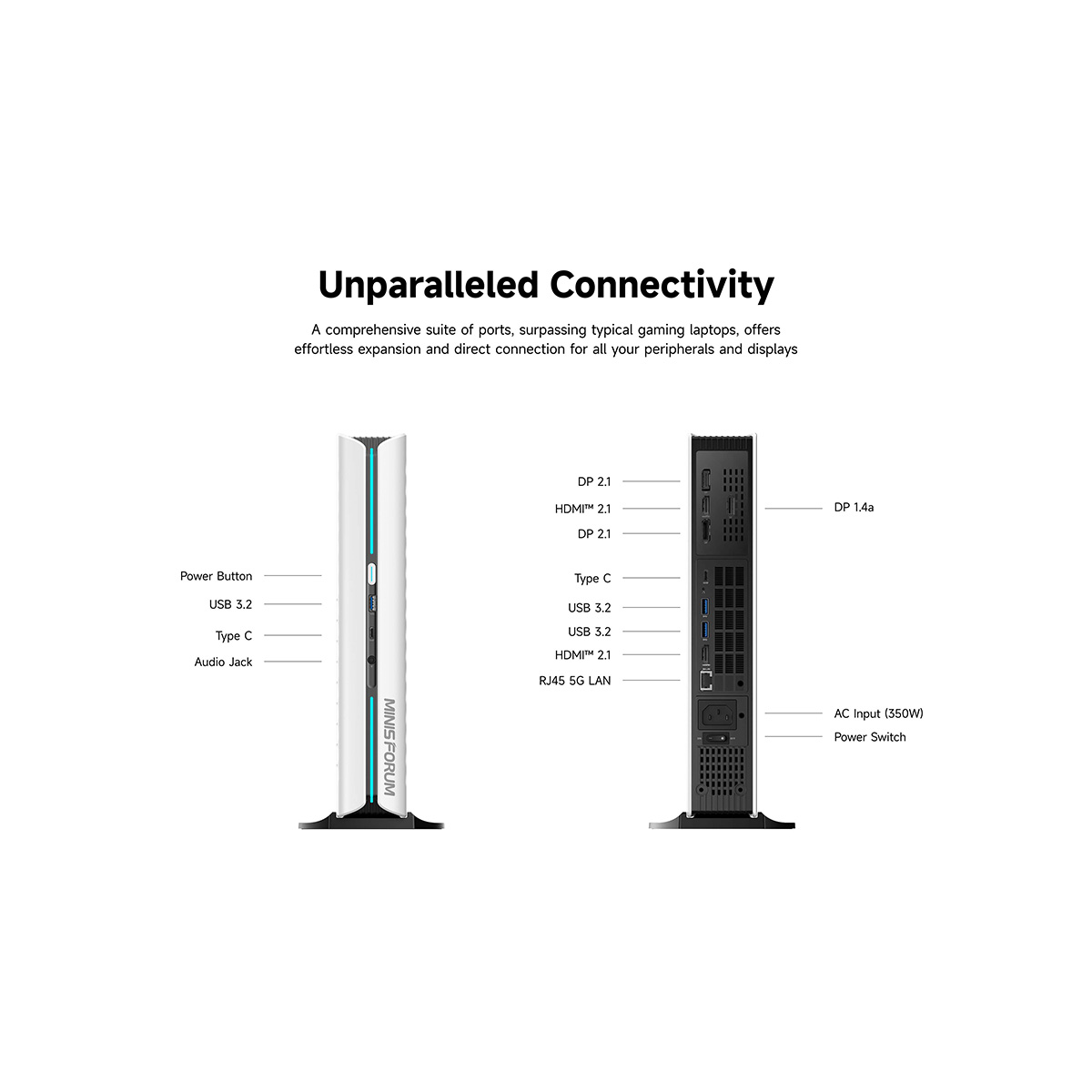 アクセスしやすい本体正面のUSB 3.2 Type-A ポート(Gen2)やUSB3.2 Type-C ポート(Gen2データのみ)端子を始め、背面にはRJ45 5G イーサネットポート、USB 3.2 Type-A ポート(Gen2)×2、USB3.2 Type-C ポート(Gen2,データのみ)×1、HDMI 2.1 ×1、DP2.1b ×2、DP1.4a ×1を搭載し通常のミニPCを凌駕するインターフェースを多数搭載しています。