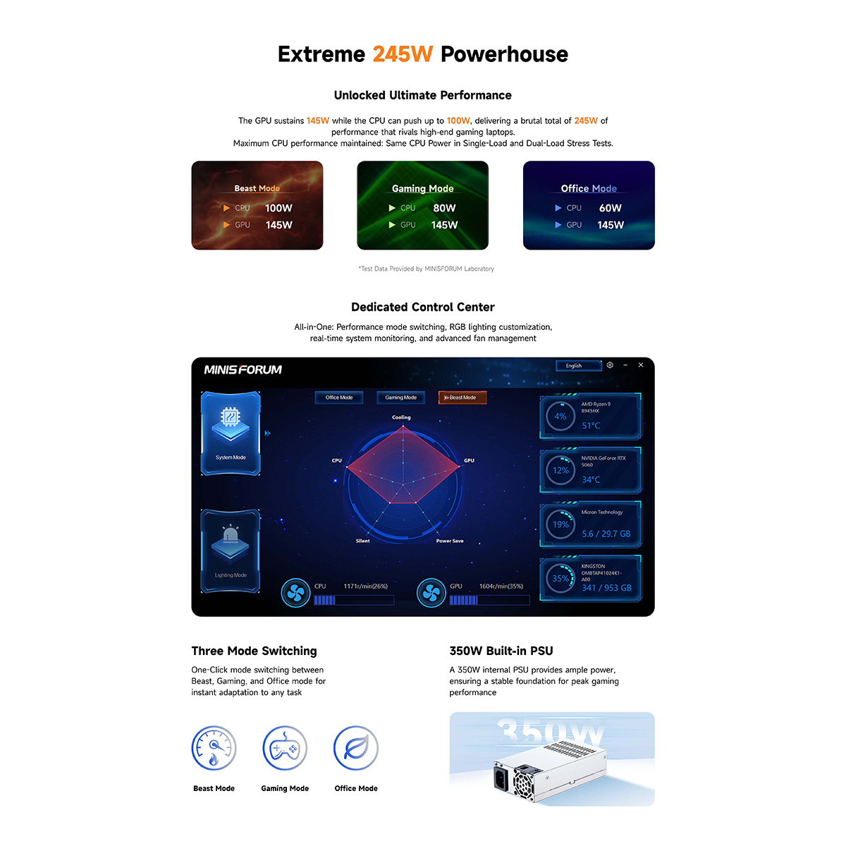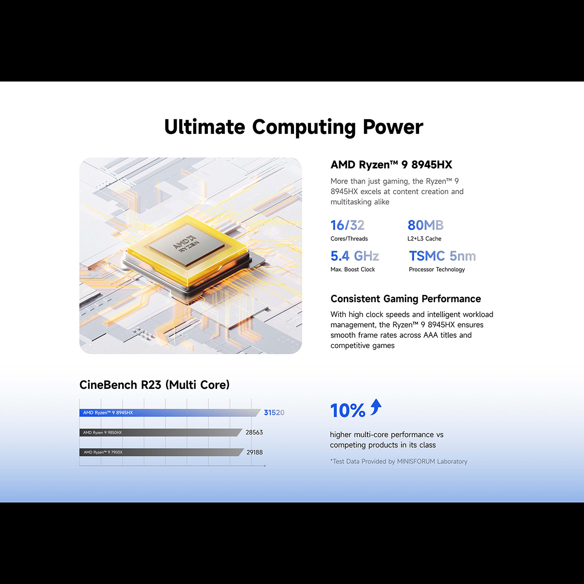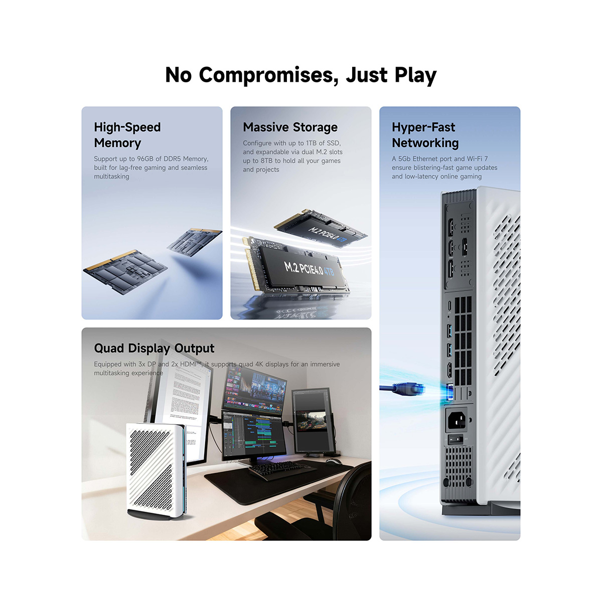 DDR5 5200 MHzのメモリを32 GBの大容量で標準搭載し、AMD Ryzen™ 9 8945HXの高い性能をフル活用し、従来のミニPCを遥かに上回るパフォーマンスを発揮します。