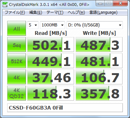 CSSD-F60GB3Aは、SATA 6Gb/s(SATA3.0)インターフェースを搭載したMLCタイプのSSDです。容量は60GBです。コントローラーICにSandForce製チップを採用しています。最大読み込み525MB/s、最大書き込み490MB/sの高速な動作を実現しています。