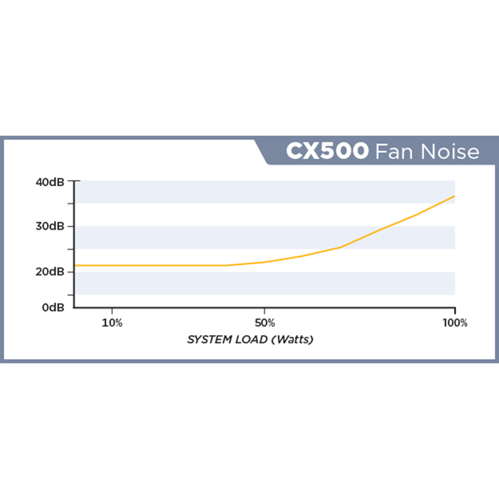 CX500は、ATX12V v2.3準拠、80PLUS BRONZE認証を取得した電源ユニットです。容量500W、1系統38Aの出力を発揮します。自動回転数制御に対応した120mm静音ファンにより、優れた静音性を実現します。