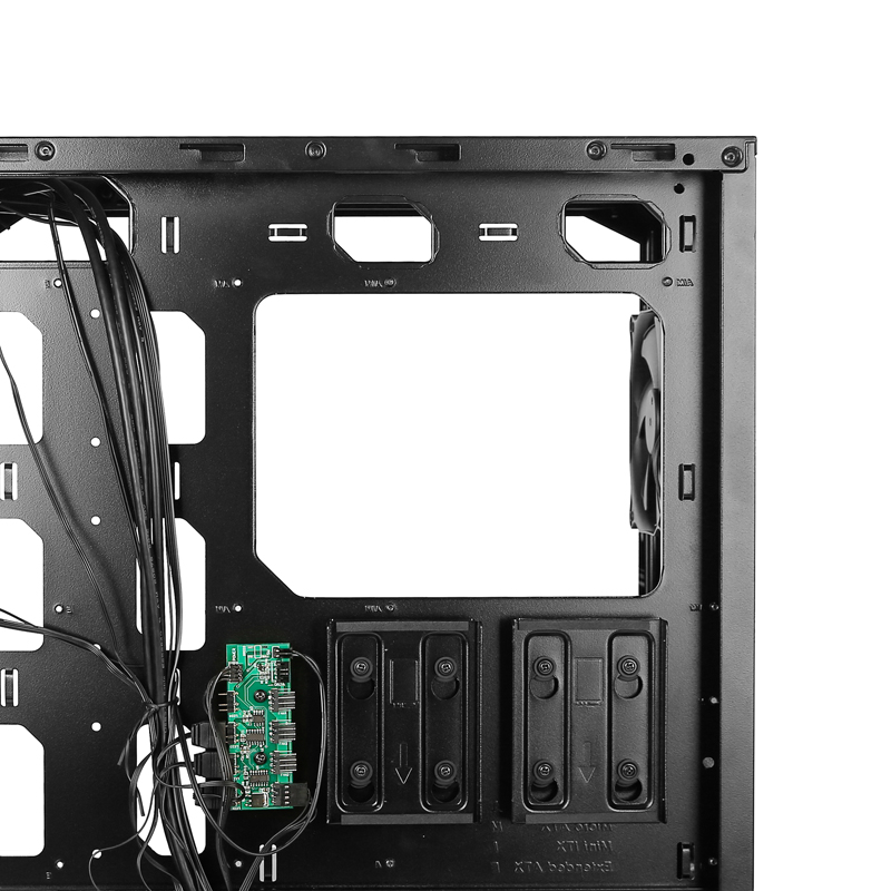 マザーボードベース背面に、4つのARGBファンを制御する専用のファンコントローラーを搭載しています。接続されたARGBファンは、ケーストップに備えられたLEDモードコントロールスイッチにより、フロントパネルに搭載されたイルミネーション「X-ARGB-Strips」と連動させた色鮮やかなイルミネーションを演出します。