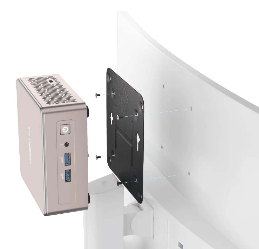 金属製のVESA規格対応マウントが付属し、対応するモニターの背面などへ取り付け、更に省スペース化することが可能です。