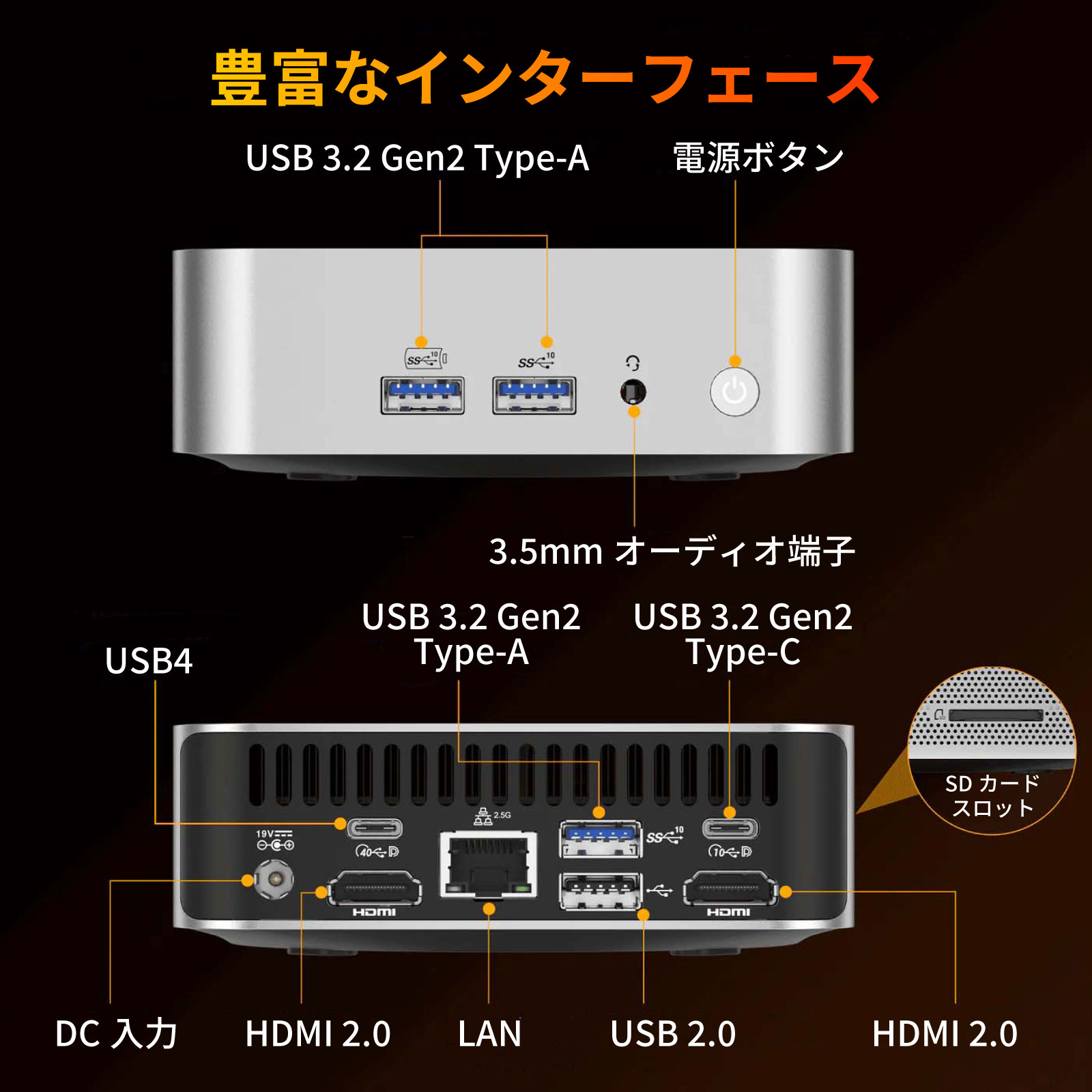 アクセスしやすい本体正面のUSB 3.2 Gen2端子を始め、USB4や2.5G LANポートなどの高速端子も搭載し高い拡張性を確保しています。SDカードスロットにより、データのバックアップや写真データの管理も便利に行うことができます。