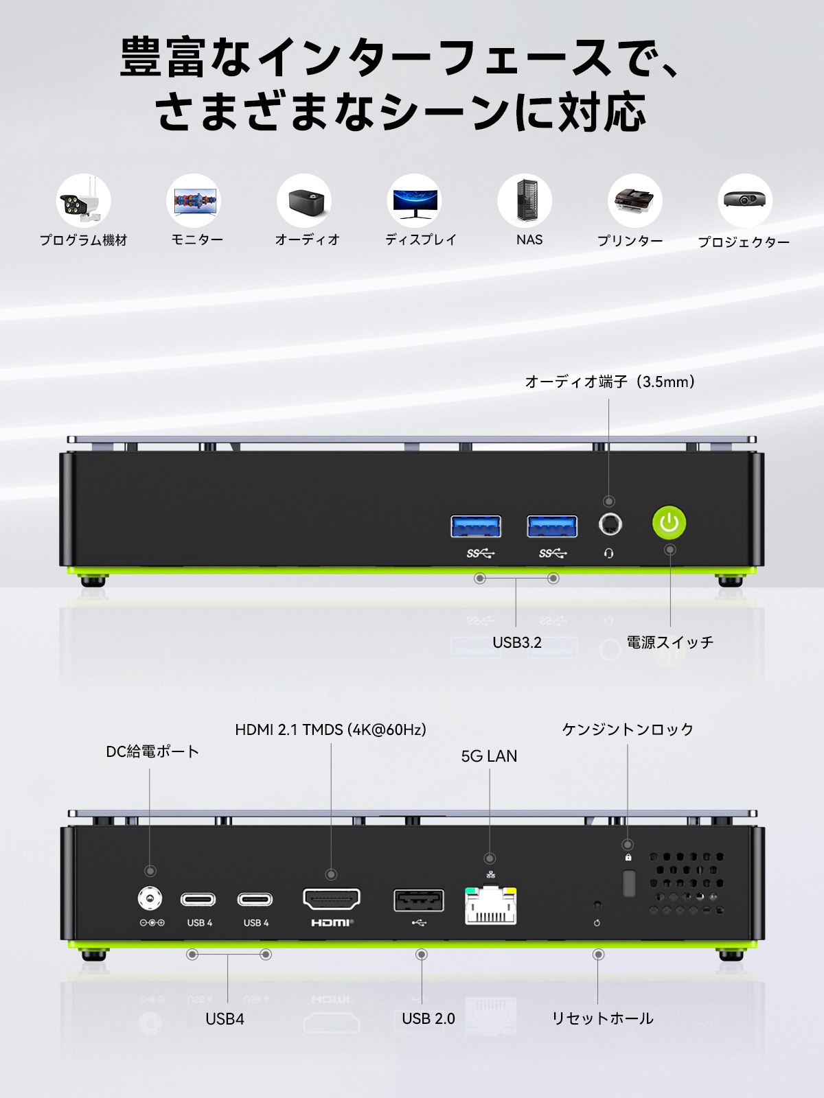 アクセスしやすい本体正面のUSB 3.2 Gen2を始め、 背面には2つのUSB4端子など最新の高速インターフェースを多数搭載しています。5G LANポートを搭載し、高速ネットワーク接続が要求される用途にも対応します。