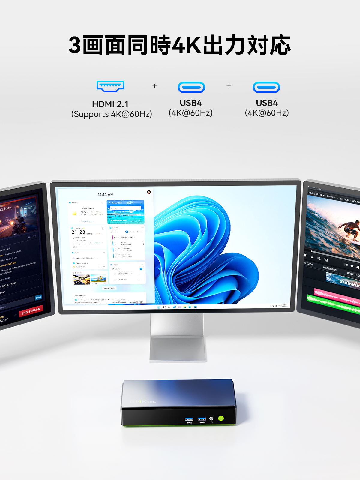 HDMI 2.1 TMDSと2つのUSB4ポートにより3画面の同時出力に対応します。最大で4K@60 Hzの高解像度にも対応し、大画面マルチモニター環境を構築することができます。