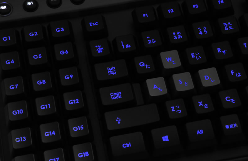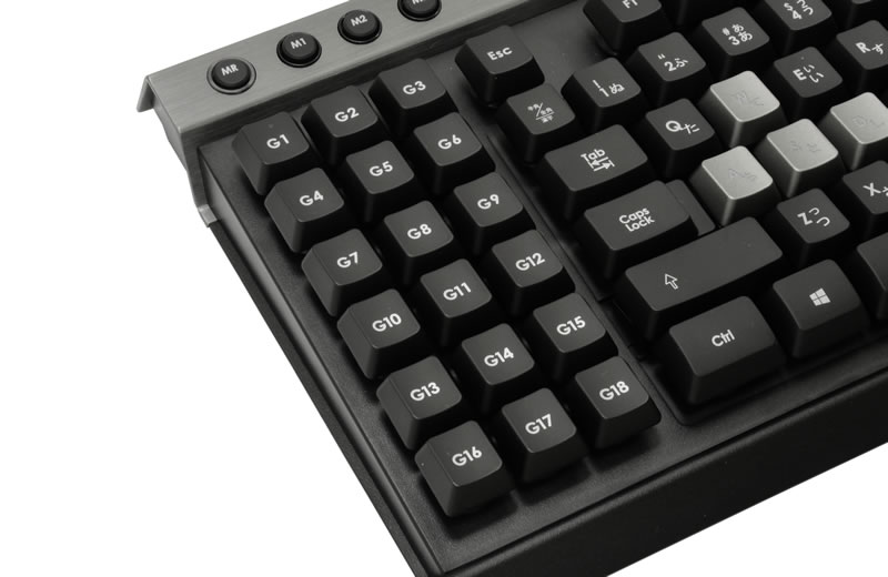 36KBのオンボードメモリを搭載しています。キーボード左端部に備えられた18個の専用マクロキーは、M1、M2、M3のバンクに切り替えることで、最大54個(3×18)のマクロを設定が可能です。