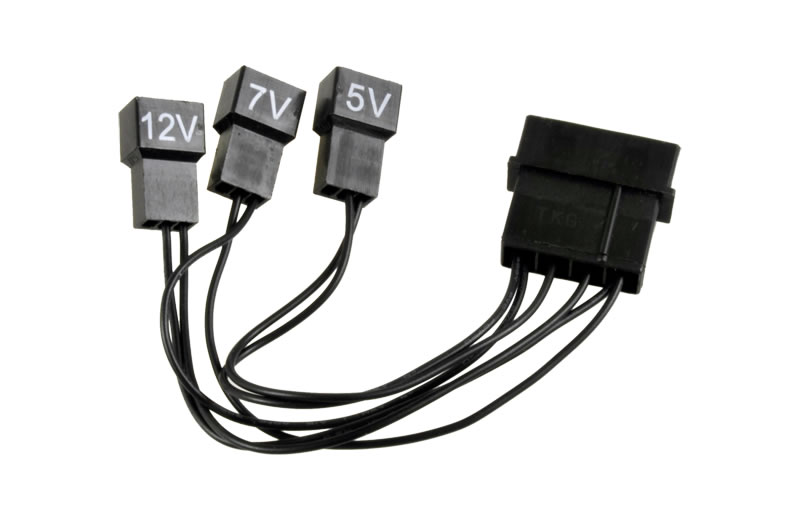 3つの回転数調整アダプタを付属しています。4ピンペリフェラルコネクタより12V、7V、5Vのファン用電源コネクタへ変換します。システムに合わせて回転数の調整が可能です。