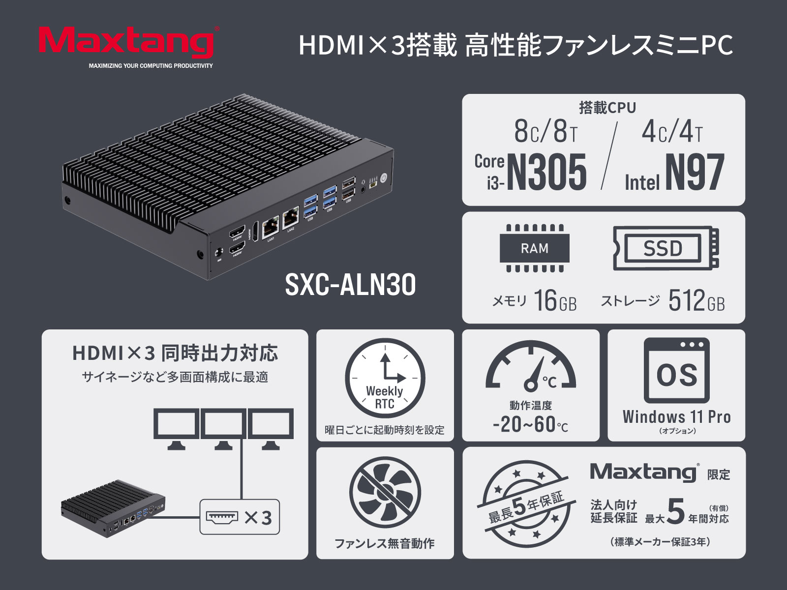 Maxtang SXC-ALN30は、Intel N97 / Core i3-N305を搭載したファンレスミニPCです。わずか35 mmの薄型筐体で、-20℃から60℃までの過酷な温度環境にも対応し、屋外や半屋外に設置するデジタルサイネージなどの機器への組み込みにも対応します。HDMI 2.0を3ポート搭載し大画面マルチディスプレイ環境に幅広く対応します。Linux環境向けにOSレスのモデルをラインアップし、オプションとしてWindows 11 Proプリインストールが可能なほか、Weekly RTC(リアルタイムクロック)機能で曜日別に起動時間を設定することができるため、平日・土日など稼働時間が異なる施設での運用にも適しています。