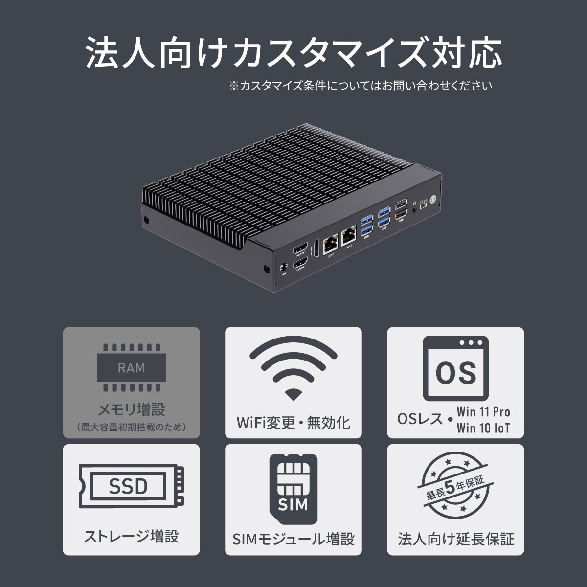 Linux導入に最適なOSレスのモデルをラインアップするほか、デジタルサイネージなどの組み込みを始め、法人用途に最適なWindows 10 IoTやWindows 11 Proをプリインストールしたモデルへのカスタマイズに対応します。