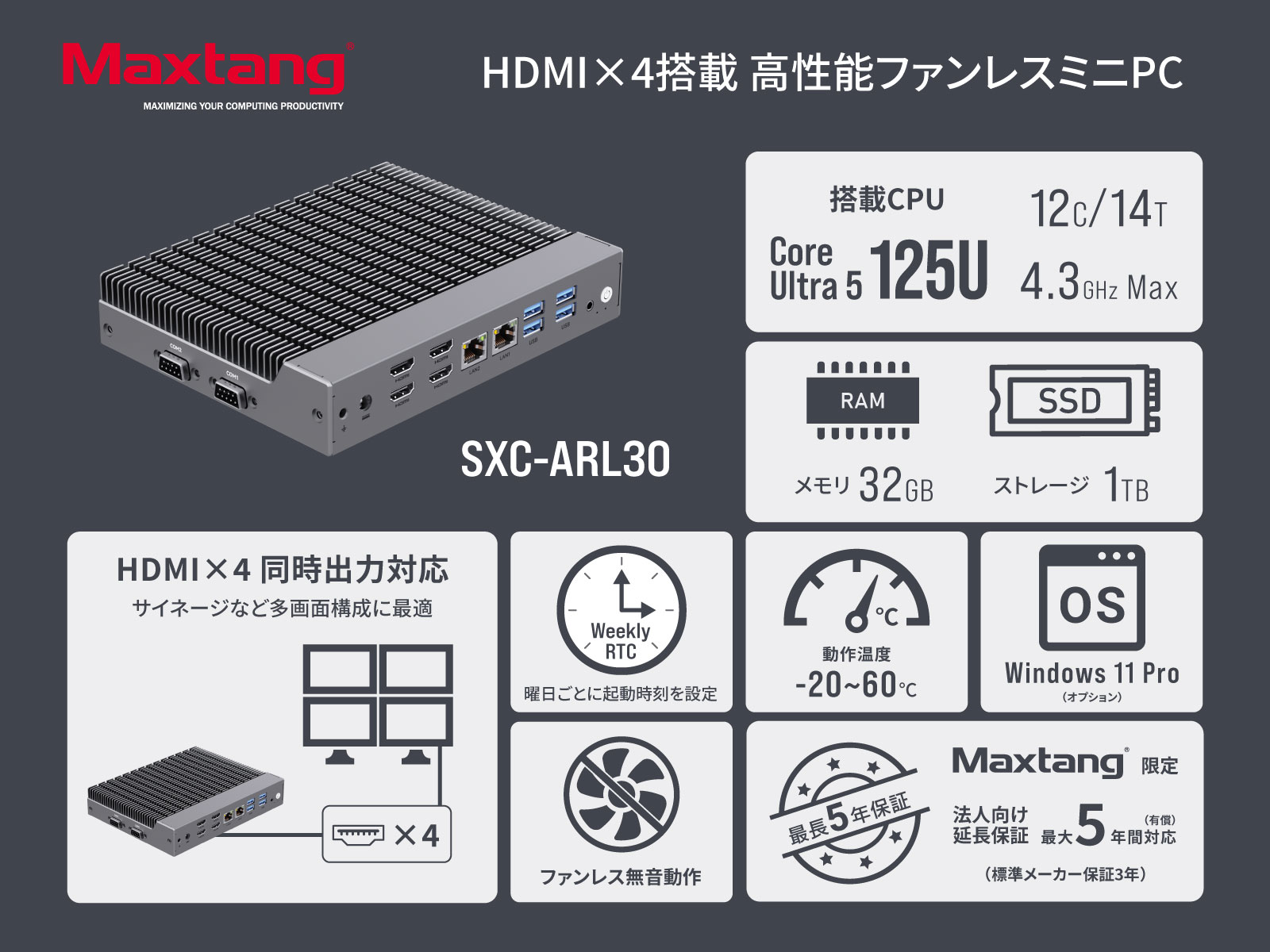 Maxtang SXC-ARL30は、高性能なCore™ Ultra 5 125Uを搭載したファンレスミニPCです。わずか35 mmの薄型筐体で、-20℃から60℃までの過酷な温度環境にも対応し、屋外や半屋外に設置するデジタルサイネージなどの機器への組み込みにも対応します。HDMIとUSB-C経由で最大4台の画面出力により大画面マルチディスプレイ環境に幅広く対応します。Linux環境向けにOSレスのモデルをラインアップし、オプションとしてWindows 11 Proプリインストールが可能なほか、Weekly RTC(リアルタイムクロック)機能で曜日別に起動時間を設定することができるため、平日・土日など稼働時間が異なる施設での運用にも適しています。