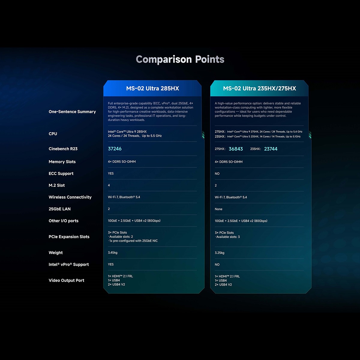 MINISFORUM MS-02 Ultraは、Intel® Core™ Ultra 9 285HX を搭載した高性能ミニワークステーションです。24コア24スレッド、最大5.5 GHz動作の高性能CPUと最大192 GBもの大容量ECCメモリを搭載し、ミニPCの範疇を超えたAI処理能力を実現します。LLMによる推論や画像生成AIなどのローカル処理の高速化、省スペース化を含めRAID 0/1/5/10をサポート、クリエイティブ用途など様々な用途に高いパフォーマンスを発揮します。