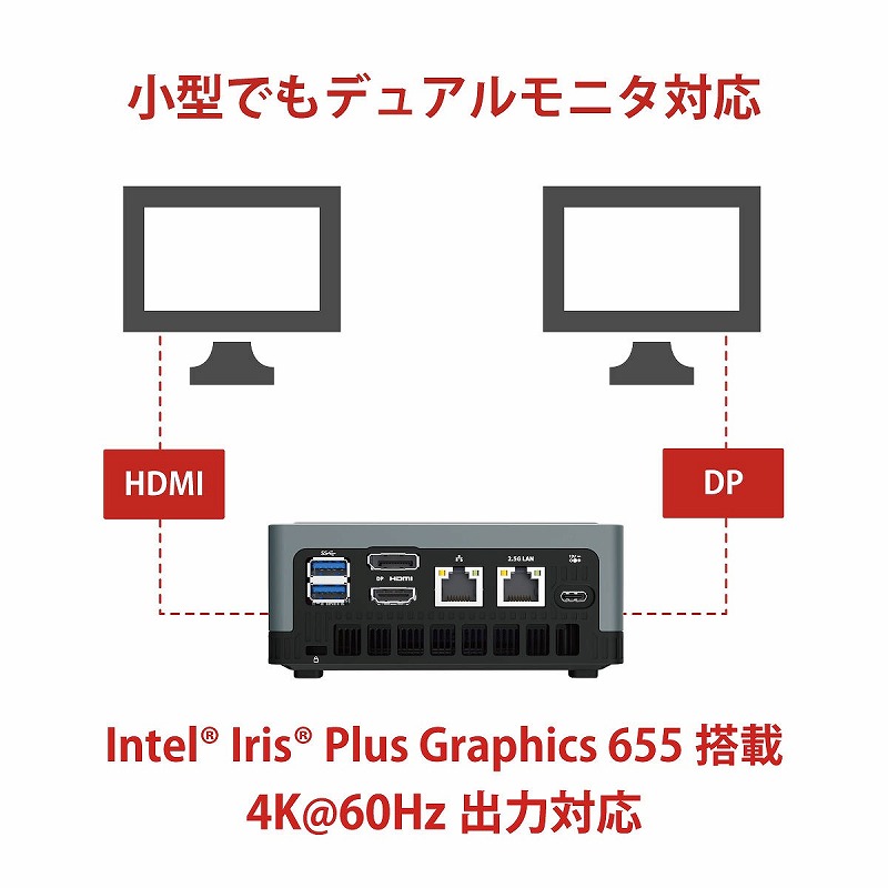 | インターフェース | 背面ポート | 1× USB-C(給電専用) 1×Gigabit LAN 1×2.5Gb LAN 1 × HDMI 1 × DisplayPort 2 × USB3.0 |