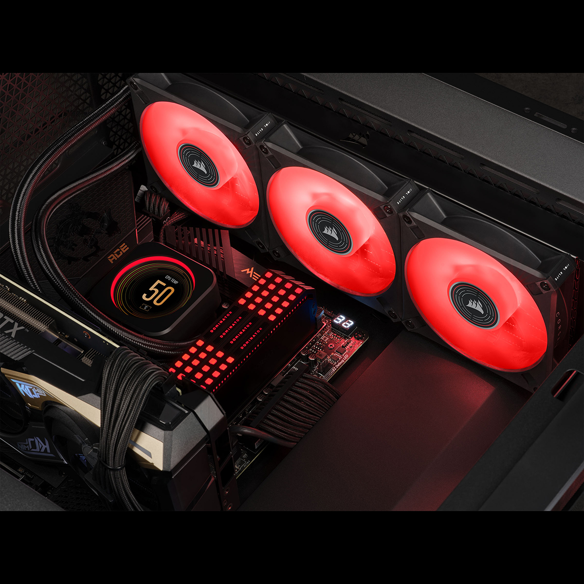 ML120 LED ELITE Redは、8つの高輝度の赤LEDを備え、圧倒的な低ノイズを実現した磁気浮上ベアリング、静圧性能を極めた独自のカスタムローター設計の採用、450RPMの低回転域から駆動する回転数制御に対応、共振を抑制する防振ラバーダンパーを搭載しています。ファン1個の増設用パッケージです。