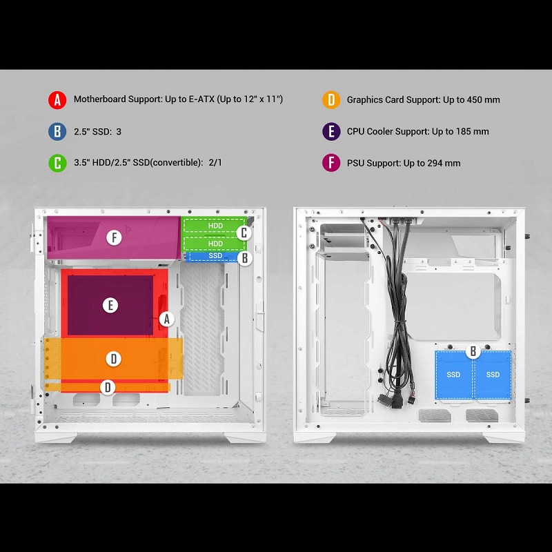 最大で450mmまでの拡張カードと294mmの電源ユニット用スペースを確保、185mmまでの大型空冷CPUクーラーにも対応します。ストレージは3.5インチ専用ベイを2基、2.5インチ専用ベイを3基まで搭載可能です。