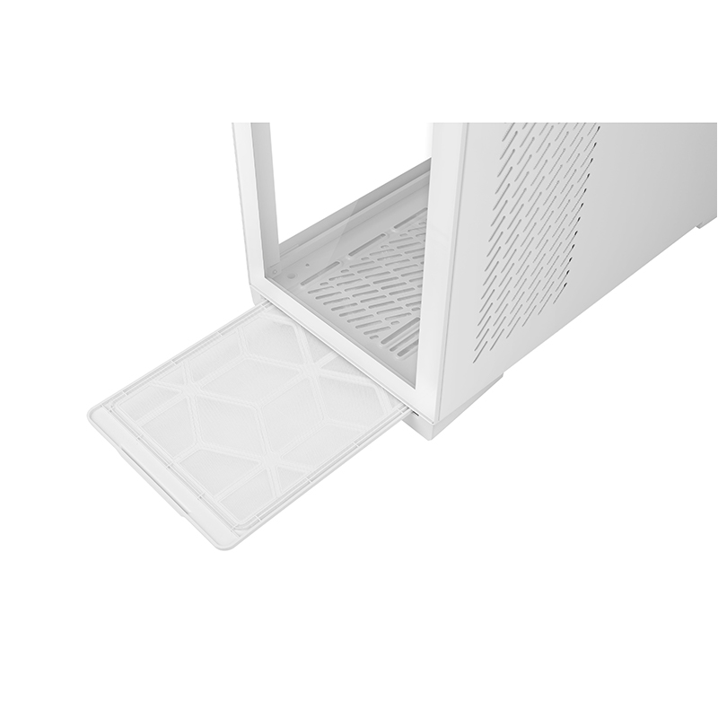 ケース底面とサイドパネルの開口部にそれぞれ着脱式のダストフィルターを備えます。底面のフィルターは直接ケース前方から引き出せるため、本体を動かさずに清掃可能です。