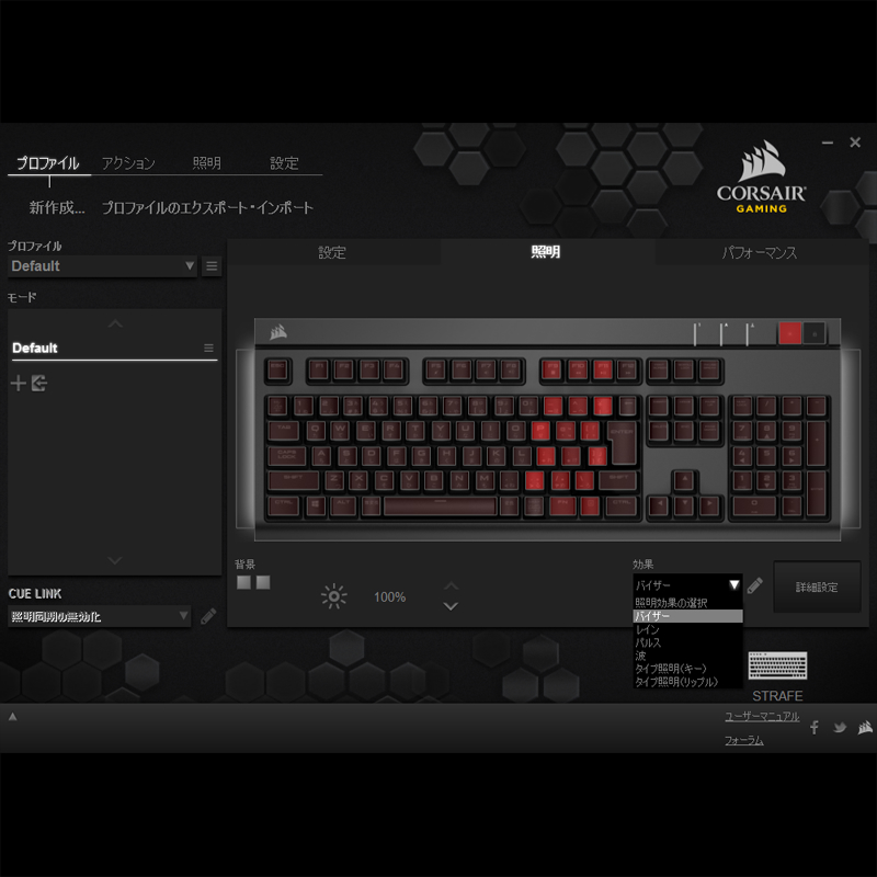 Corsair Utility Engine(CUE)によって、各キーに備えられたレッドLEDバックライトの独立制御に対応しています。イルミネーション設定、すべてのキーに登録できる高度なマクロ対応、シーンや用途に応じて4段階で切り替え可能なレポートレートなど、独自開発された先進のドライバソフトが、新次元のキーバインドを実現します。