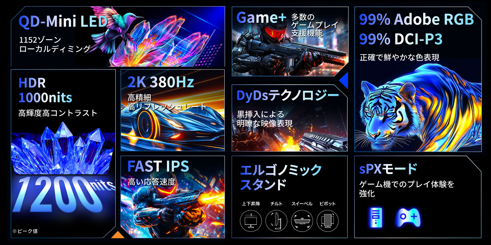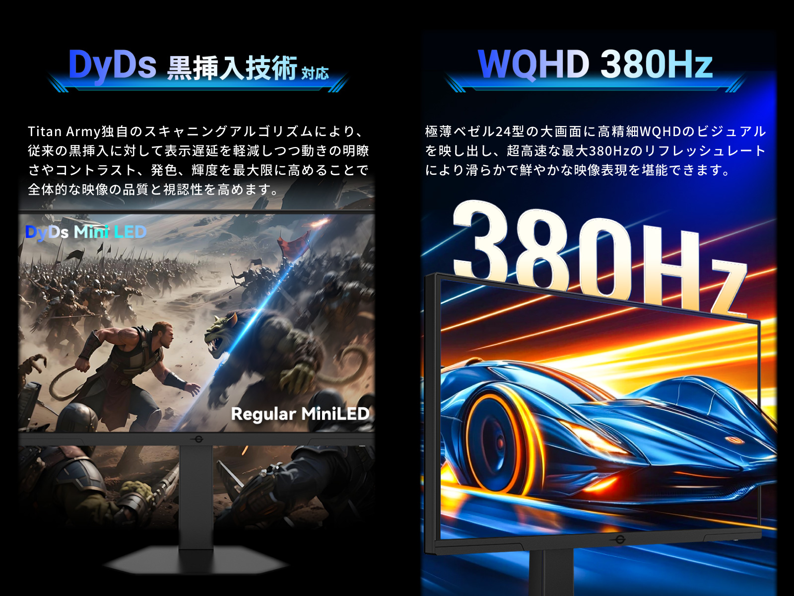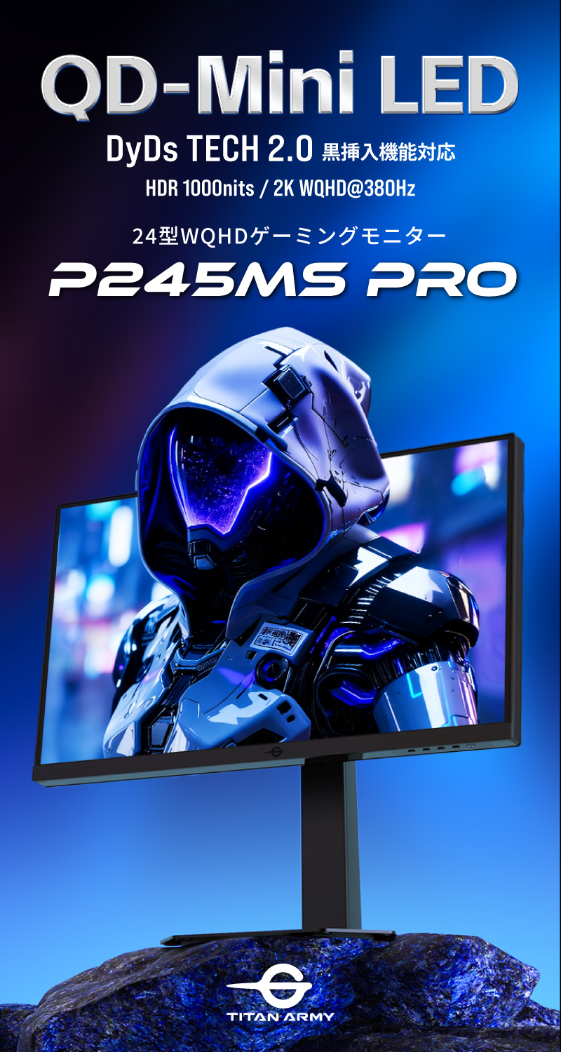 TITAN ARMY P245MS PROはMini LED、量子ドット技術を搭載し1152ゾーンのローカルディミングに対応した24型380Hz対応の高性能ゲーミングモニターです。WQHD(2560×1440)の高解像度とDCI-P3 99%、Adobe RGB 99%の広色域に対応します。最大1000nitsの高輝度が色鮮やかな表現を可能としつつ、1152ゾーンのローカルディミングにより光漏れを抑制しはっきりとした黒色を再現します。HDMI 2.1ポートを2つ備え、最新の家庭用ゲーム機においてVRR(可変リフレッシュレート機能)にも対応しています。また、進化したDyDs(ダイナミックディスプレイ)TECH 2.0により、黒挿入技術とAdaptiveSync(VRR)機能の併用を実現。これまで以上に高リフレッシュレート時の残像感、ブレを低減し明瞭な動画表現を楽しめます。