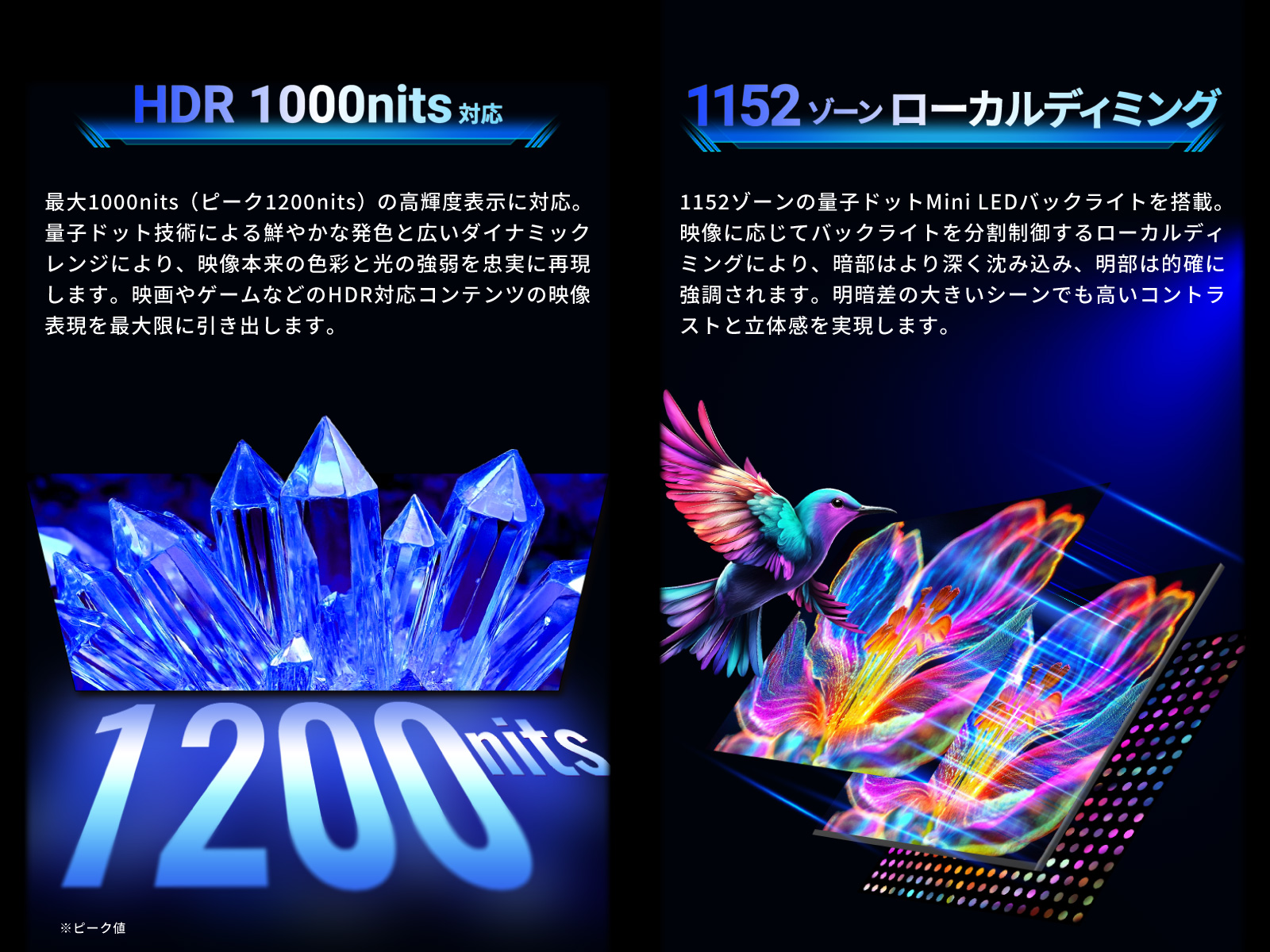 1152ゾーンの量子ドットMini LEDを搭載し、鮮やかな発色に加えて暗いところはより暗く、明るいところはより明るく表現するローカルディミングに対応しています。映像本来の発色を忠実に表現でき、映画やゲームなどのHDR対応コンテンツに最適です。