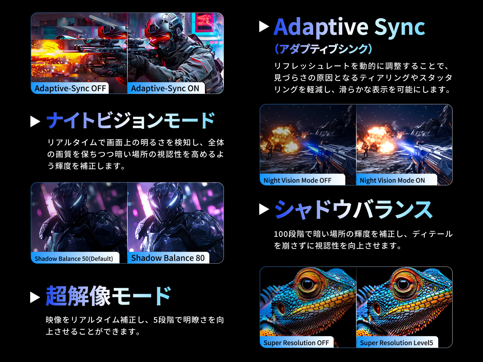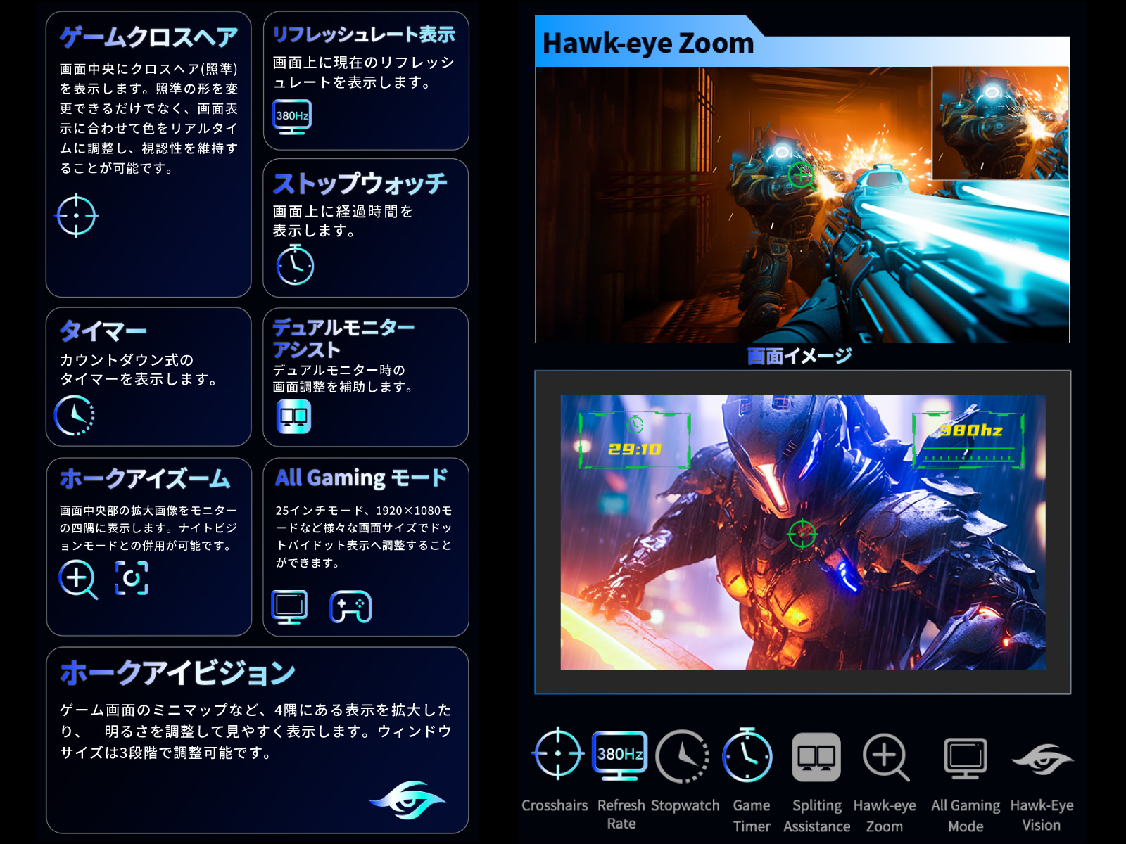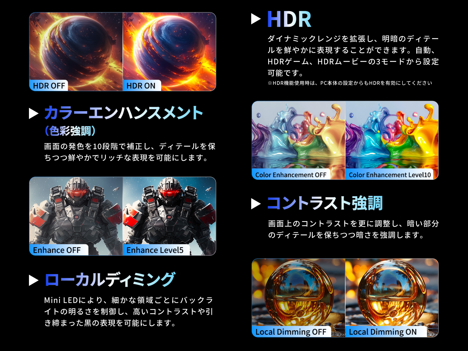 明暗のディテールを強調し、さらに鮮やかな映像を楽しめるHDR機能をはじめ、ゲームプレイやグラフィックを最大限に楽しむための支援機能を多数搭載しています。