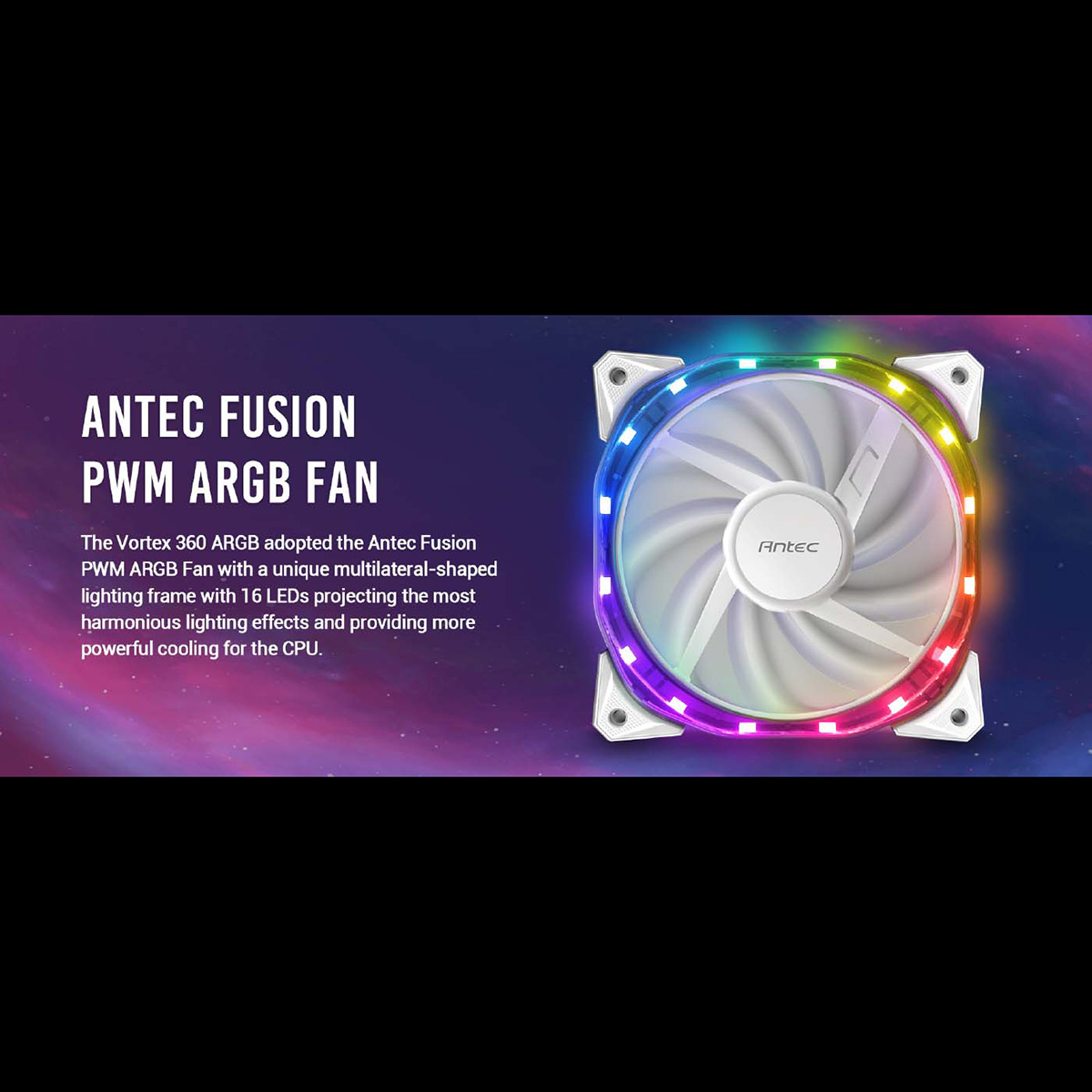 Vortex 360 ARGB Whiteは、ARGB LEDを搭載した水冷一体型ユニットのCPUクーラーです。渦をモチーフにした独特なデザインのポンプヘッドとRGB LEDにより、高い冷却性能とユニークなイルミネーションを実現します。主要マザーボードメーカーのRGB制御に対応し、専用RGBコントローラーによる一括制御が可能です。最大2000 RPMの120 mm PWMファンには16個ものARGB LEDを搭載、CPUの熱を素早く輸送して冷却し、高密度EPDMチューブによりメンテナンスフリーで長期3年の製品保証を実現します。